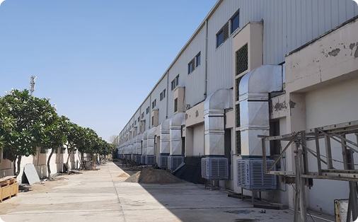 Symphony Venti Cool’s team conducted a thorough assessment of all three floors and designed a deployment plan using 26 units of the PAC 32i top-discharge cooler. Each unit was configured with eight jet nozzles for wide-angle air dispersal and connected to 15-foot ducts to reach deep into the floor spaces. A 100-litre water tank and four-sided cooling pads on each unit ensured sustained, high-volume cooling output over extended operational periods.