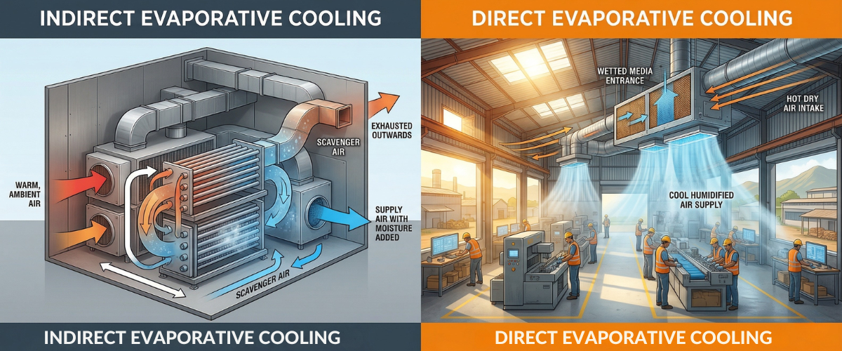 Direct evaporative cooling adds moisture to the supply air as part of the cooling process. Indirect evaporative cooling cools the air through a heat exchanger without adding any moisture. Direct systems suit dry climates; indirect systems are preferred where humidity addition is unacceptable.