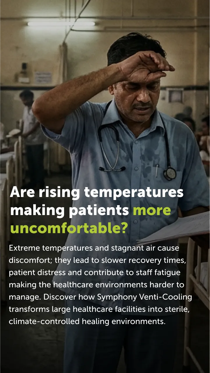 Providing a safe, breathable environment in high-density medical buildings is no longer optional; it's a standard. Symphony’s Venti-Cooling technology addresses the specific challenges of large-volume wards where traditional AC is unfeasible. By ensuring 100% fresh air displacement, we are not just cooling spaces; we are improving the quality of patient care and clinical safety across the nation.